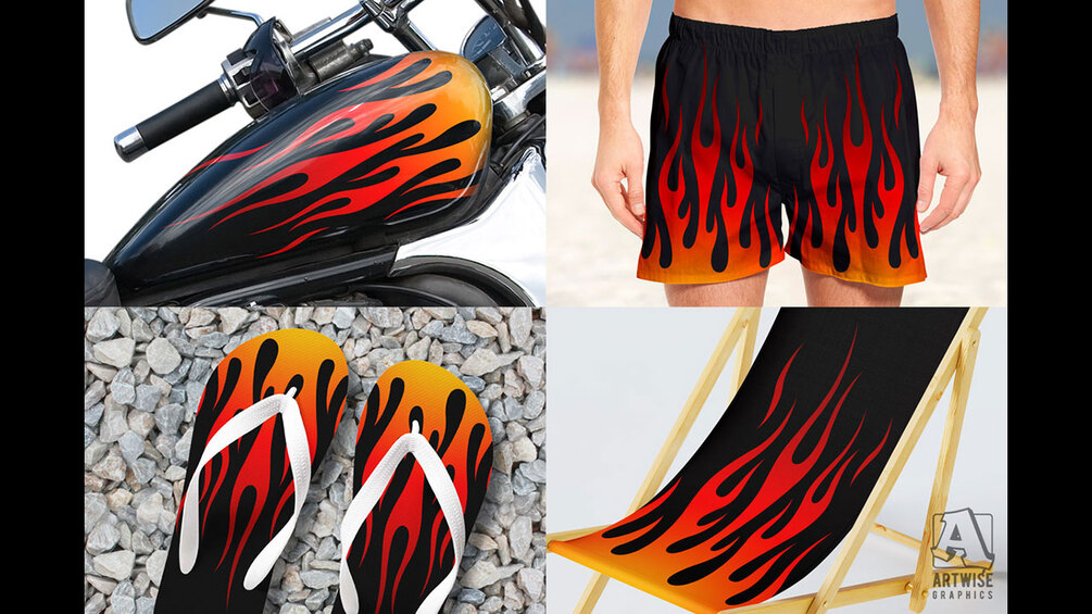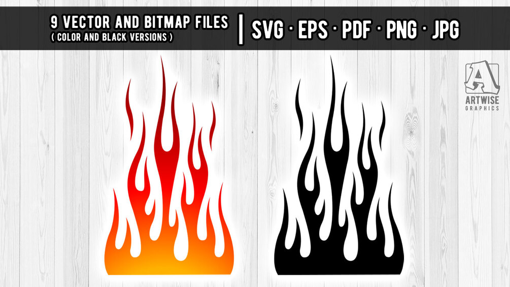 Set of Hot Rod Fire Flame Graphics in Scalable Vector SVG Cut Files and High Resolution Transparent Bitmap File Formats.